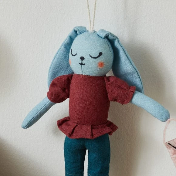 The perfect gift for gift or your child who loves bunnies. With a blue colourway and a sleeping face, this hanging bunny is has been dressed in a fashionable outfit. Coordinating products are available.