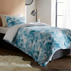 Dunelm Blue Tie Dye Ombre Faux Fur Duvet Cover and Pillowcase Set Reversible, Polyester, Patterned